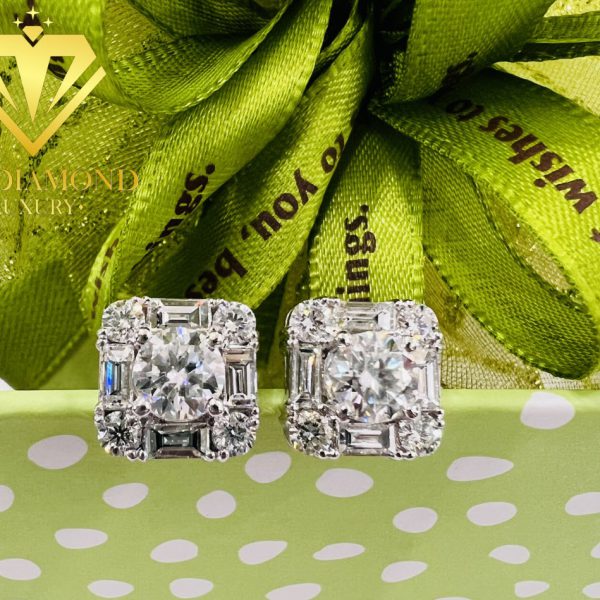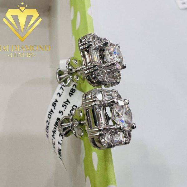 Điểm nhấn là viên chủ moissanite có kích thước 5.5mm được đính cố định trên 4 chấu ở vị trí chính giữa. Đây là một loại kim cương nhân tạo, có độ tinh khiết và vẻ đẹp lấp lánh rất giống với kim cương tự nhiên, nên nó càng làm tăng thêm sự nổi bật và tỏa sáng cho đôi bông tai. Chưa kể, bao quanh viên chủ còn có thêm 8 viên kim cương tròn và 8 viên kim cương hình chữ nhật. Chúng được sắp xếp đan xen với nhau, khiến cho đôi bông tai luôn rực rỡ từ mọi góc nhìn.