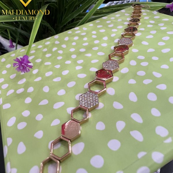 Chiếc lắc tay KC-LTN 016 được thiết kế đơn giản nhưng lại vô cùng tinh tế, với những hình lục giác nối liền nhau giống như cấu trúc của tổ ong trong tự nhiên. Những chi tiết của chiếc lắc tay đều được chế tác rất tỉ mỉ với nhiều họa tiết độc đáo xếp xen kẽ nhau như: hình lục giác đính kim cương, hình lục giác trơn bóng, hay viền hình lục giác, tạo nên tổng thể một chiếc lắc tay khá độc đáo và cuốn hút.