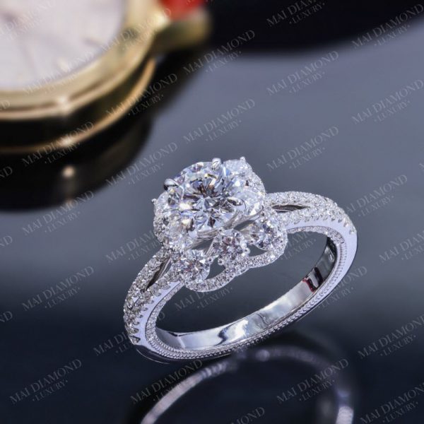 Đính giữa mặt nhẫn sẽ là viên kim cương chủ tự nhiên quý hiếm với giác cắt tròn rất tinh xảo và chuẩn xác. Mặt nhẫn được các nghệ nhân khéo léo tạo kiểu với các viên kim cương nhỏ ôm quanh 4 chấu thanh mảnh, tạo thành hình một bông hoa rạng rỡ, vừa thanh cao vừa duyên dáng. Các viên kim cương nhỏ tự nhiên được đính kết tỉ mỉ sẽ giúp tô điểm cho vẻ đẹp lấp lánh, quyến rũ của viên kim cương chủ ở vị trí trung tâm.