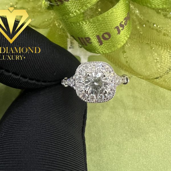 Phần mặt nhẫn lại được chế tác với kiểu dáng hình cushion khá độc đáo và khác biệt, đính trên đó là rất nhiều viên kim cương tấm tự nhiên giúp cho chiếc nhẫn luôn tỏa sáng từ mọi góc nhìn.