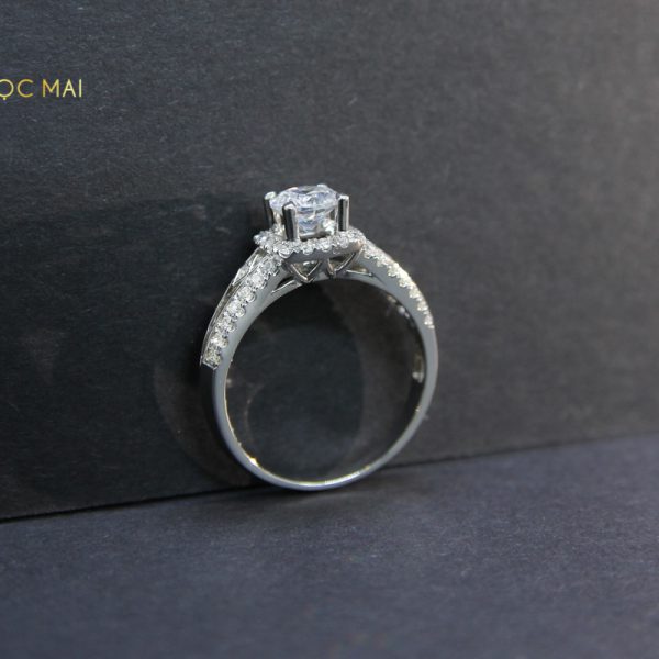 Chiếc vỏ nhẫn nữ kim cương đầy phong cách này được thiết kế vô cùng tỉ mỉ với vòng nhẫn được làm từ vàng trắng 14K, kết hợp với các viên kim cương tự nhiên trong suốt thượng hạng được đính trên cả mặt nhẫn và hai bên đai nhẫn. Trên mặt nhẫn, các viên kim cương được sắp xếp thành một vòng tròn bao quanh lấy vị trí trung tâm để dành để đặt viên kim cương chủ có kích thước lớn hơn, giúp cho chiếc nhẫn thêm phần sang trọng và quý giá.